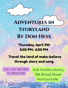 Don Hess will be presenting Adventures in StoryLand. Travel the land of make believe with story and song on Thursday, April 9, 2026, from 5:00 pm to 6:00 pm. Registration is required by calling 570-368-1840.