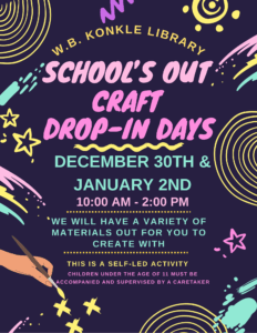 Looking for something to do over the holiday break? Why not come to Konkle’s Craft Drop-In Day? We will have a variety of materials out for you to create with. Children under the age of 11 must be accompanied by an adult. Have any questions, please call us at 570-368-1840.