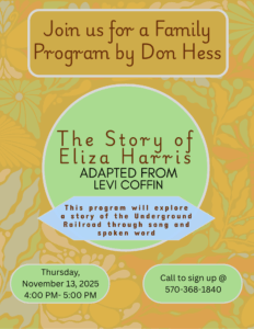 Join us for a Family event featuring Don Hess and his program on the Story of Eliza Harris, adapted from Levi Coffin. This program will explore a story of the underground railroad through song and dance. Please call the library at 570-368-1840 to register your family today. Please indicate number in your party when calling.