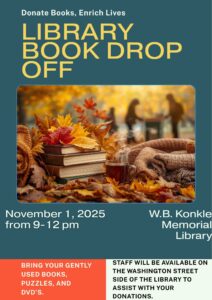 Friends of the Library Book Drop Off Event is scheduled for November 1, 2025, from 9 to 12pm. Staff will be on hand to assist with your donations. Please access drop off on Washington Street, on side of Library. Any questions as to what is acceptable for donations, please call library at 570-368-1840.