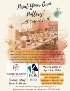 The W.B. Konkle Memorial Library is partnering with Centered Earth to bring you the opportunity to use your creativity and imagination to design your very own pottery. Come to the library, paint your project, and Centered Earth will take it back to their studio to fire it in their kiln. There will be a wide variety of pottery pieces to choose from, so there’s something for everyone. Projects will be available at the library for pickup at a later date.