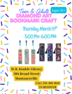 Looking for a way to unwind and get creative? Join us for our Teen & Adult Diamond Art Bookmark program! We will supply all the materials for you to create your own one-of-a-kind bookmark. Program is for ages 14+ and adults. Please call the library to register at 570-368-1840.